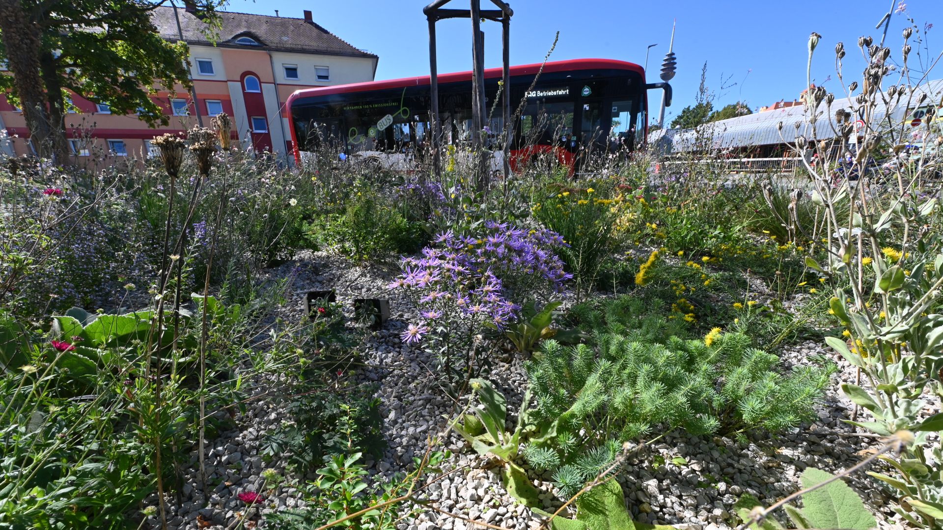 „Richtig schön“, findet der für die VAG-Buswerkstatt zuständige Geschäftsbereichsleiter Andreas Laumen, den Wandel. Rund um die Abstellhalle aus den 1980er Jahren, aber auch auf dem neuen Vordach an der Abstellhalle und dem Dach des Trafogebäudes grünt und blüht es.